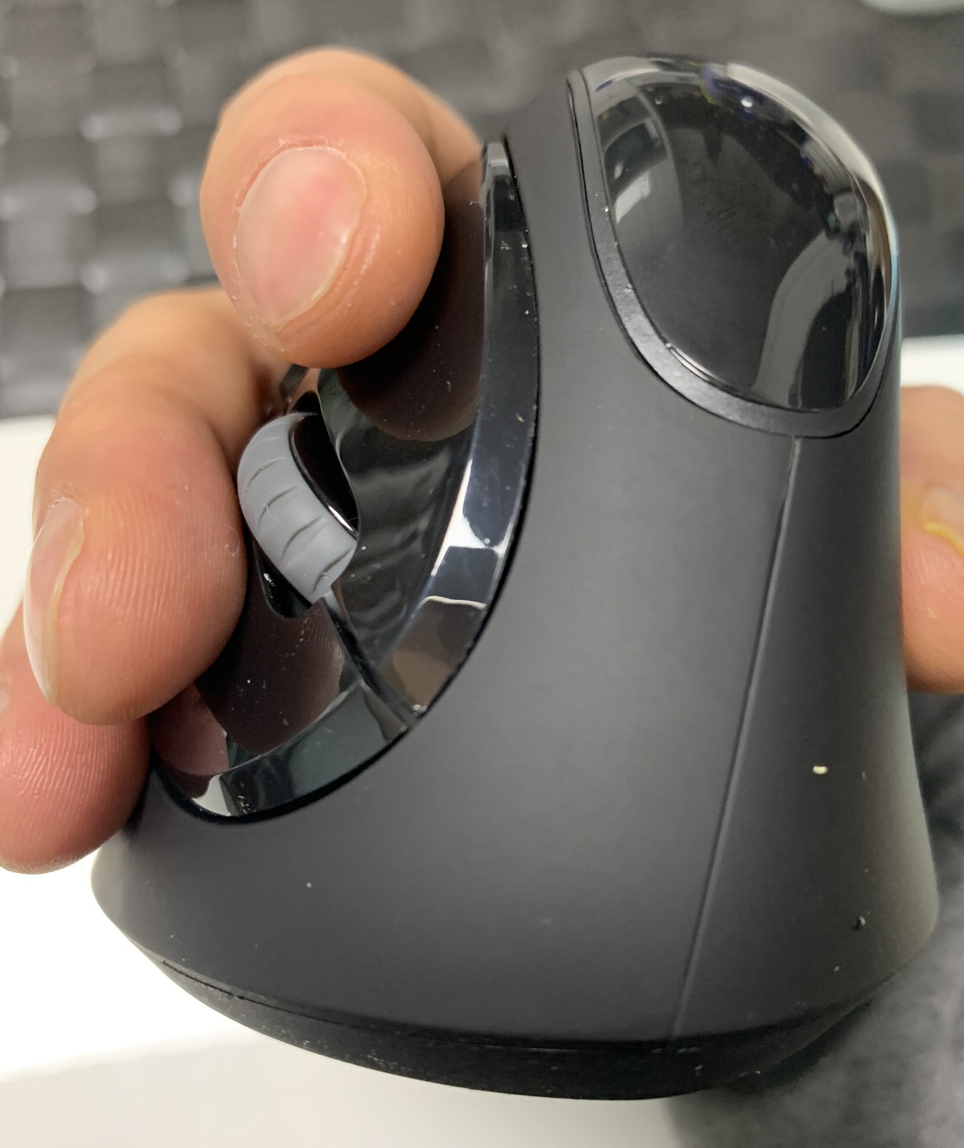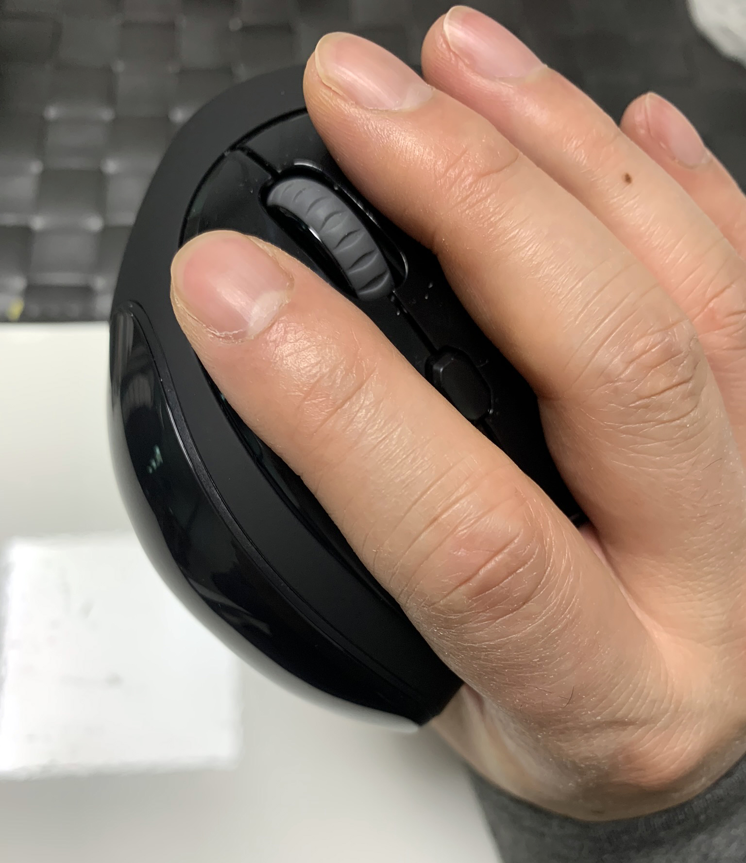 손으로 잡아서 보면 제 검지 손가락이 좌클릭 버튼 끝이 아닌 조금 모자르게 위치해 있습니다.