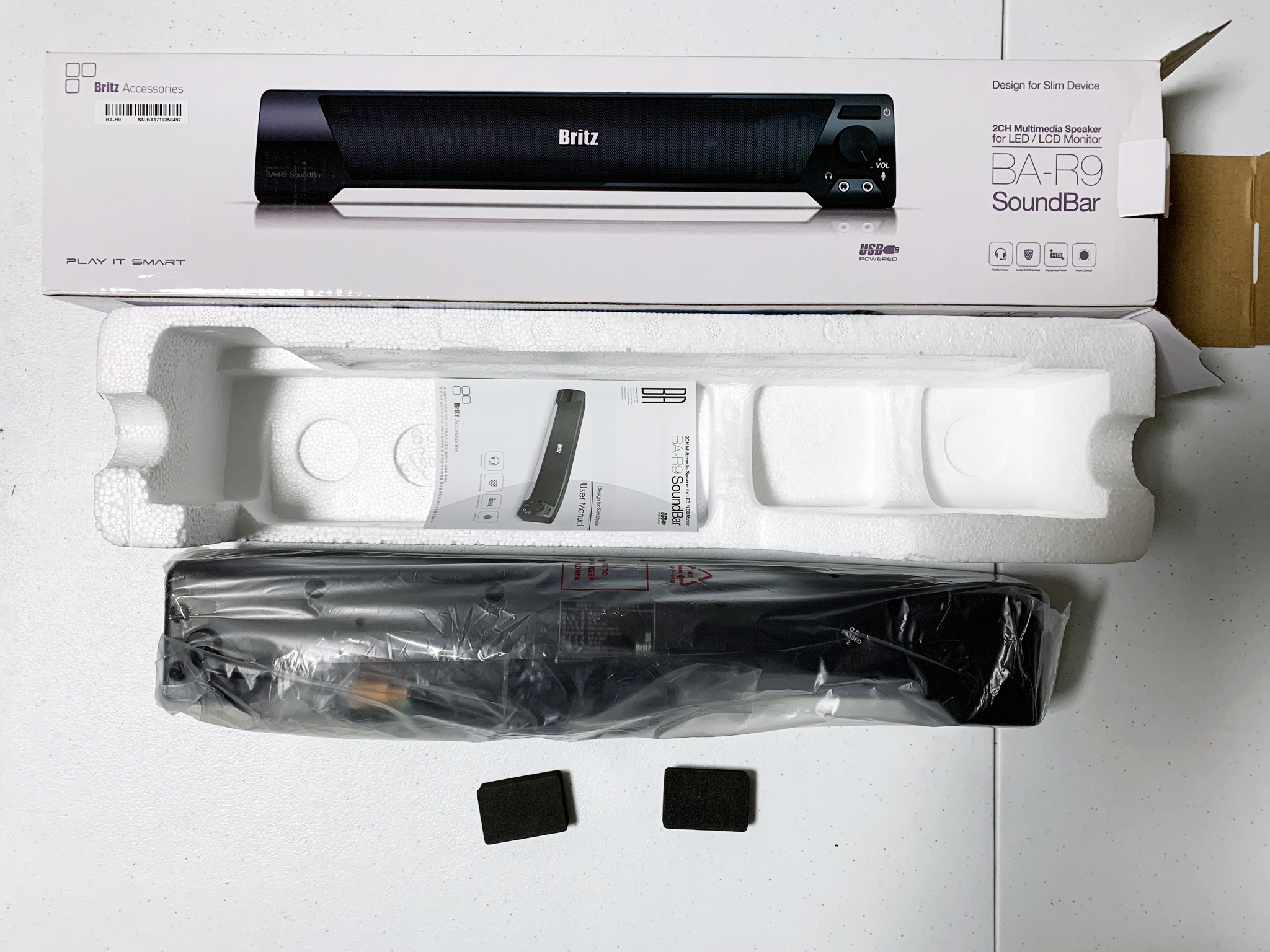 박스를 열면 설명서와 함께 브리츠 사운드 바가 보입니다. 그리고 추가 고무패드가 있습니다.