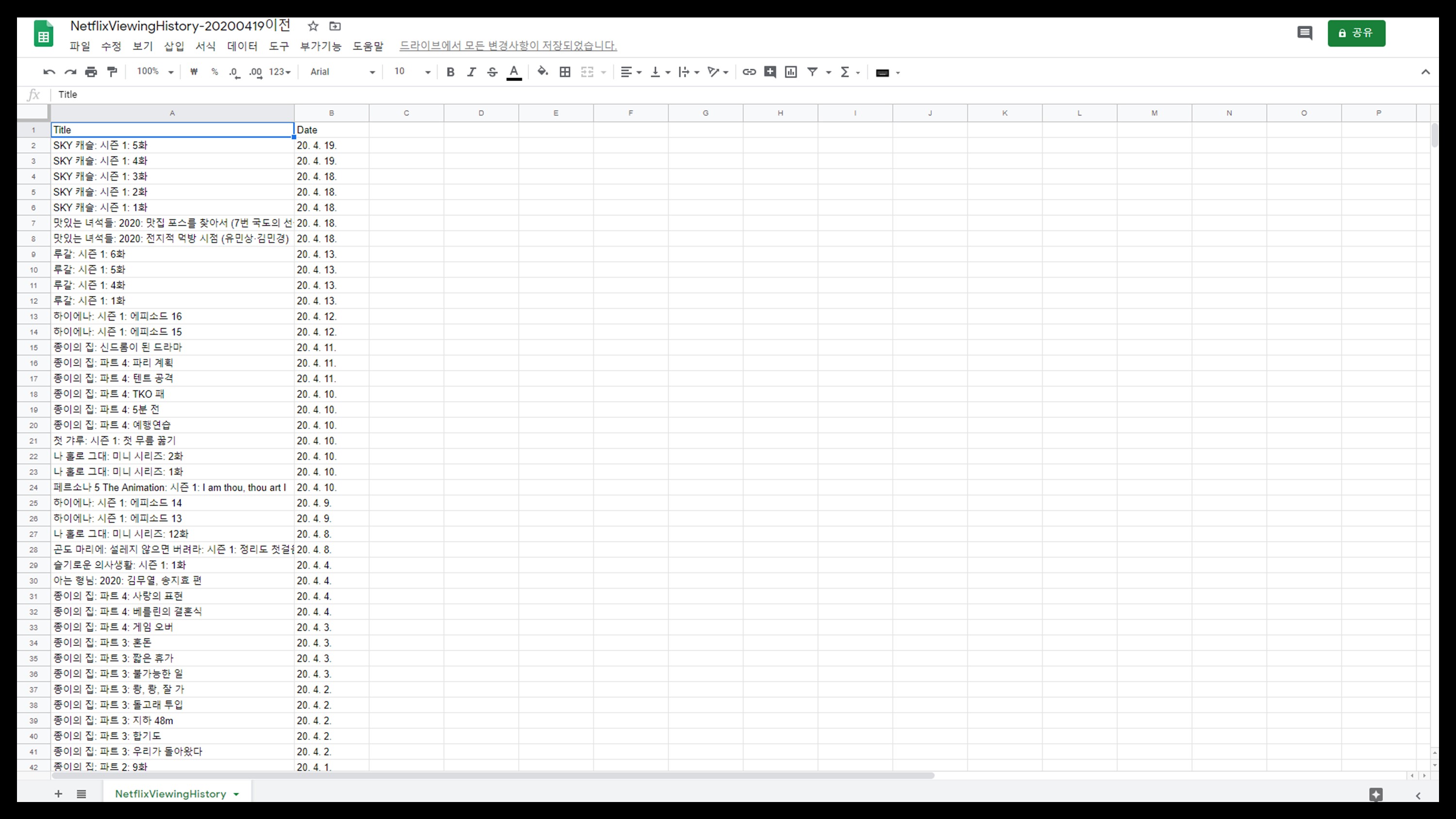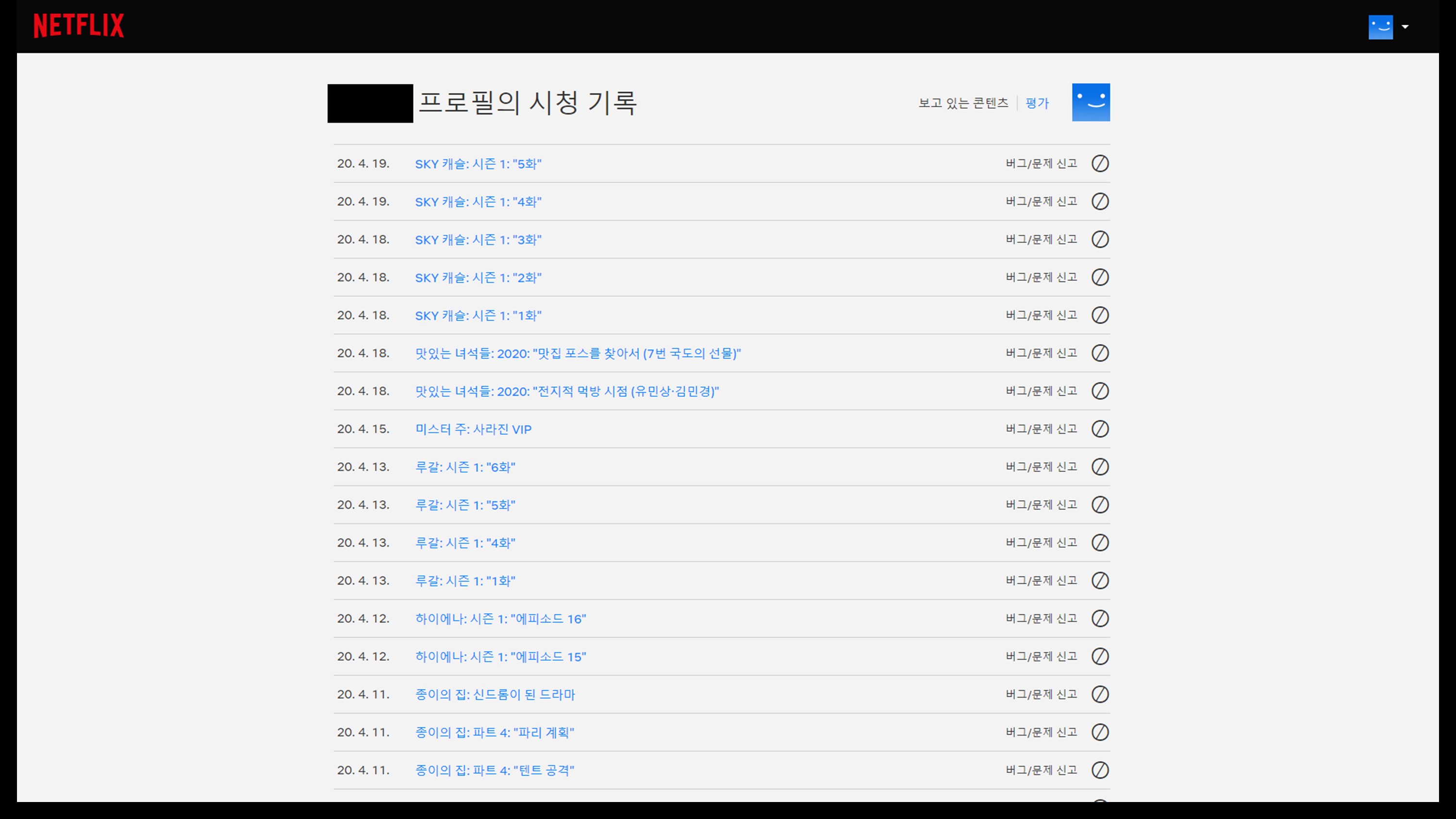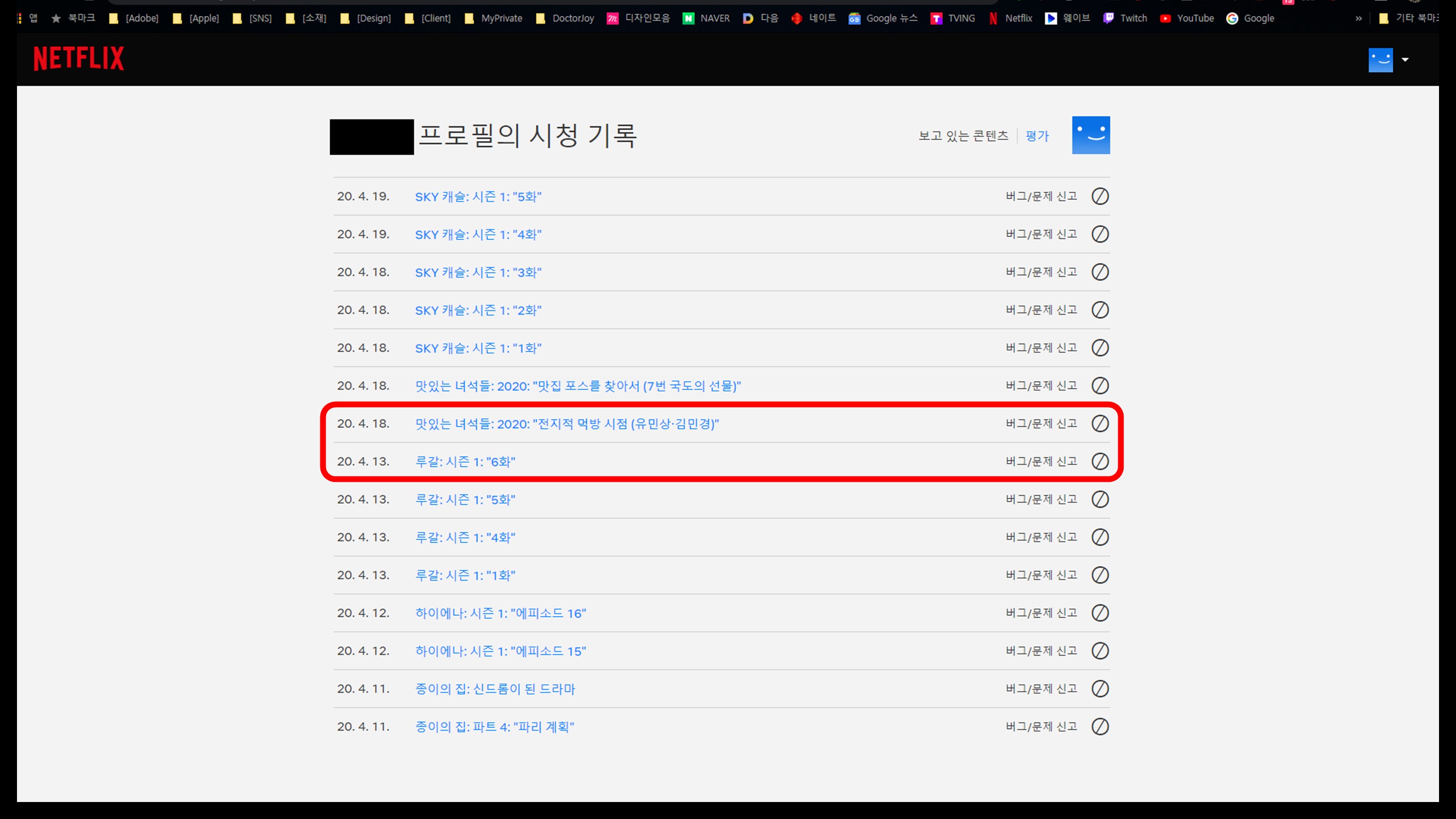 최근에 본 SKY캐슬이 딱 보이네요. 맛있는 녀석들도 있습니다. 얼마전까지 2020년 시즌은 안보이던데 재계약이 된건지 맛있는 녀석들 2020년 시즌도 보여서 보기 시작했습니다. 미스터 주: 사라진 VIP는 이성민이 주인공으로 나온 영화인데 넷플릭스에서 자꾸 추천하길래 그냥 봤습니다. ㅋㅋ 최근에는 최진혁이 나오는 루갈을 보고있는 중이고, 하이에나와 종이의 집까지 봤네요...