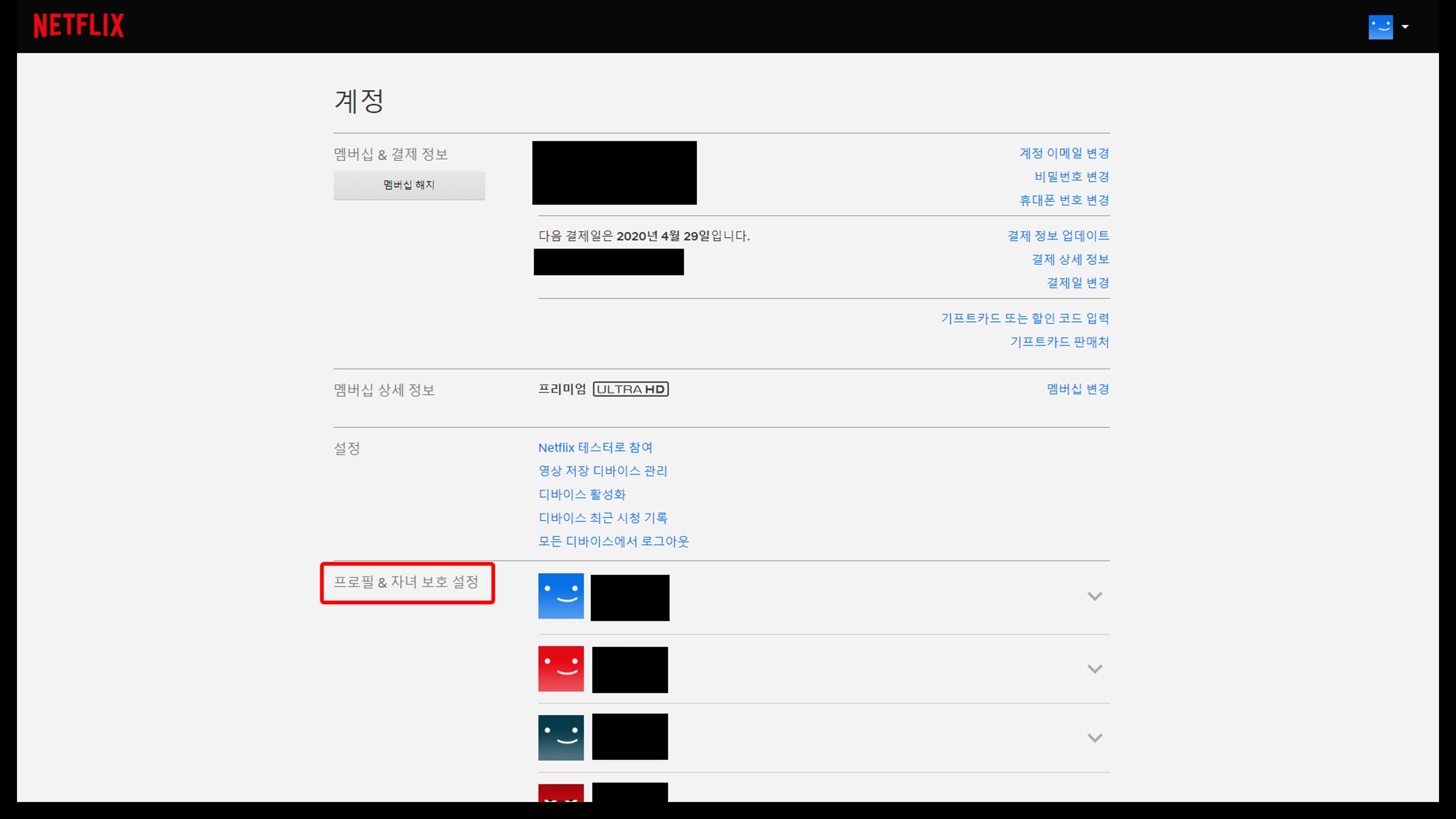 계정에 들어가면 예전에는 시청기록이 [프로필]구역에 있었는데 지금은 [프로필&자녀 보호 설정]으로 되어 있습니다.