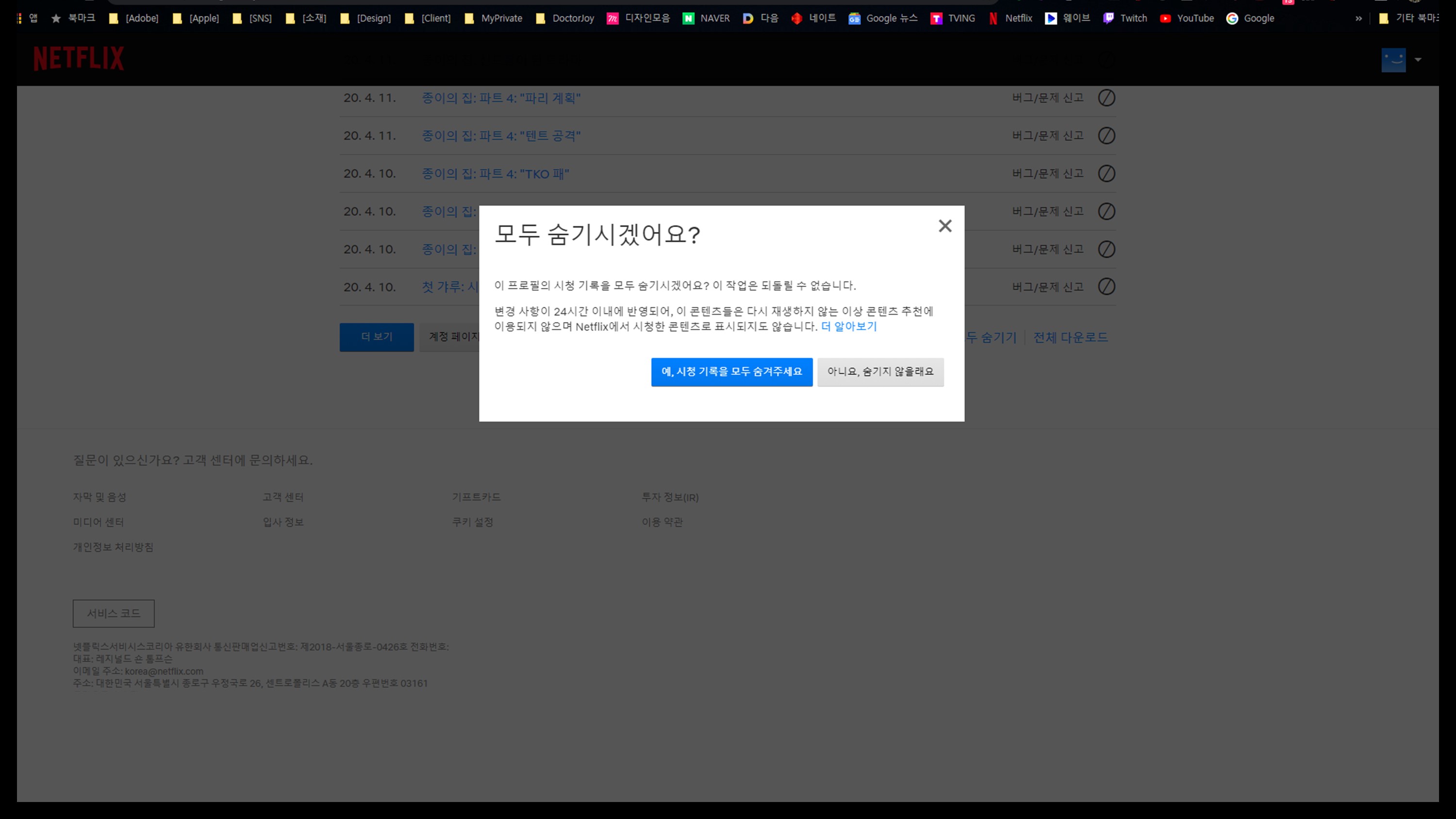 이렇게 경고창이 나오고 '예, 시청 기록을 모두 숨겨주세요.'를 선택하시면 시청기록이 전부 삭제됩니다.