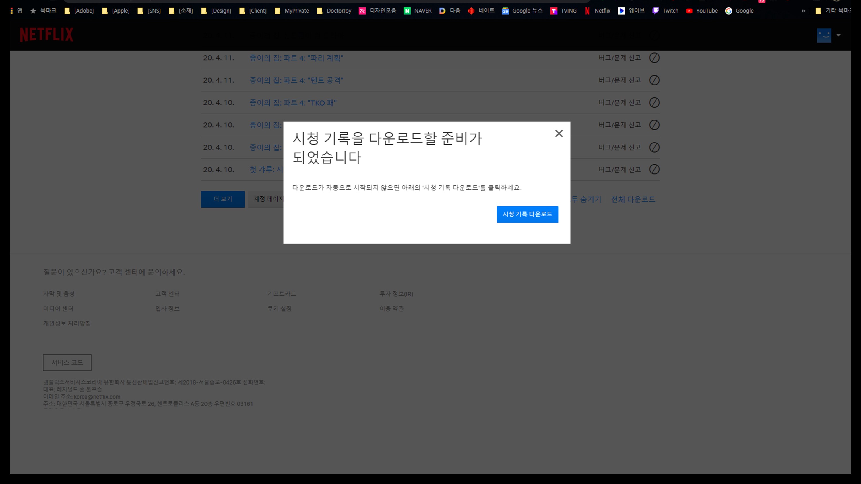 알림 창이 열리고 다운로드를 클릭하시면 시청기록 내역을 저장할 수 있습니다. 기본 파일명은 NetflixViewingHistory.csv 파일로 저장됩니다.