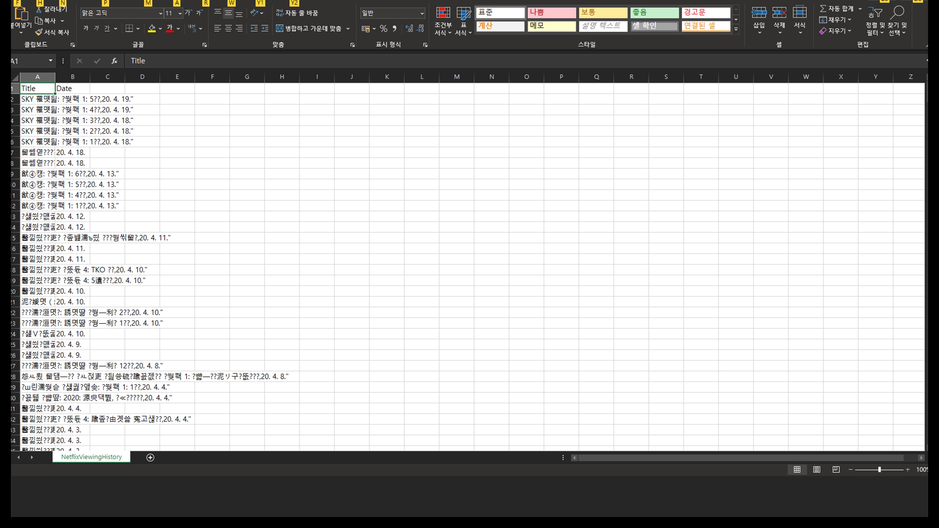 다운로드를 한 후 그냥 더블클릭으로 열면 저는 오피스365를 사용해서 엑셀로 다운로드된 파일이 열립니다. 그런데 보시면 한글이 전부 깨져 있는 상태입니다.