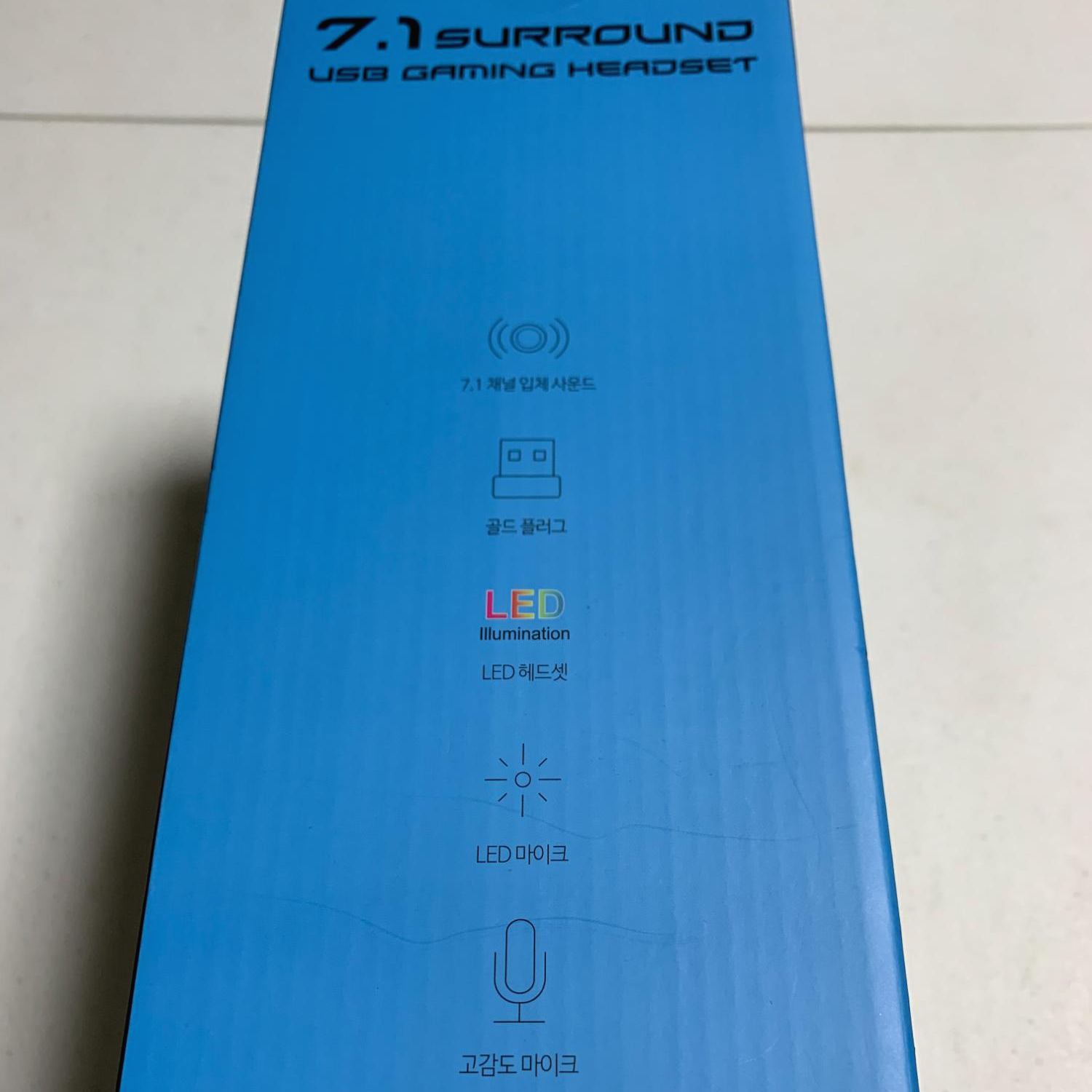 왼쪽위에 7.1체널 표시와 함께 LED 헤드셋임을 알 수 있는 제품사진이 전면에 있습니다.