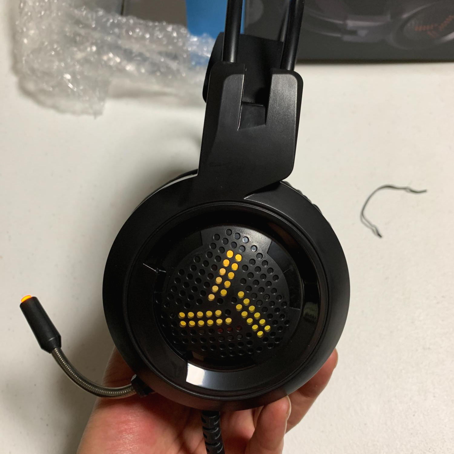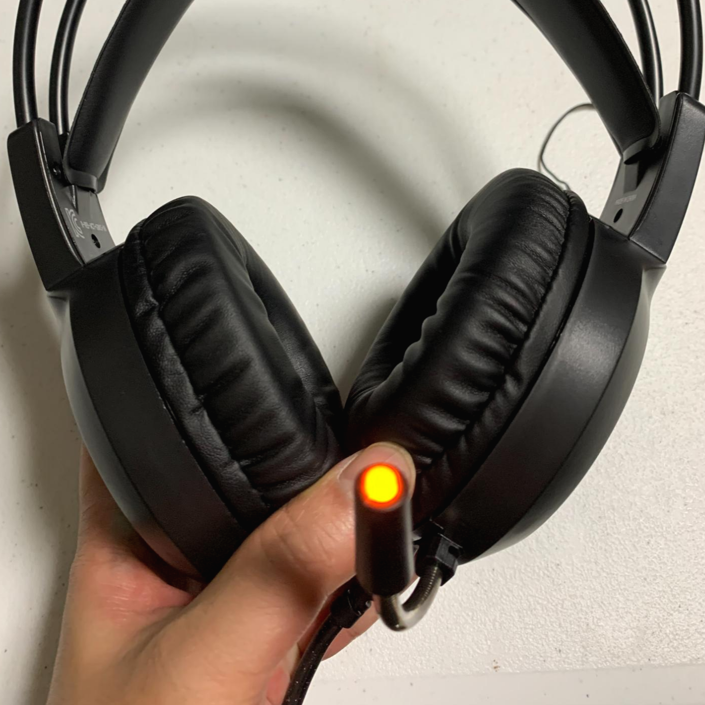 반대쪽 모습입니다. 여기는 노랑색 불빛이네요. 이렇게 이어 패드 옆쪽에 있는 LED 색상은 일정시간이 지날때마다 변경됩니다. 마이크가 붙어있는 쪽 이어 패드 뒷편에 볼륨조절을 할 수 있는 휠이 있습니다. 처음에 찾는데 고생좀 했습니다.