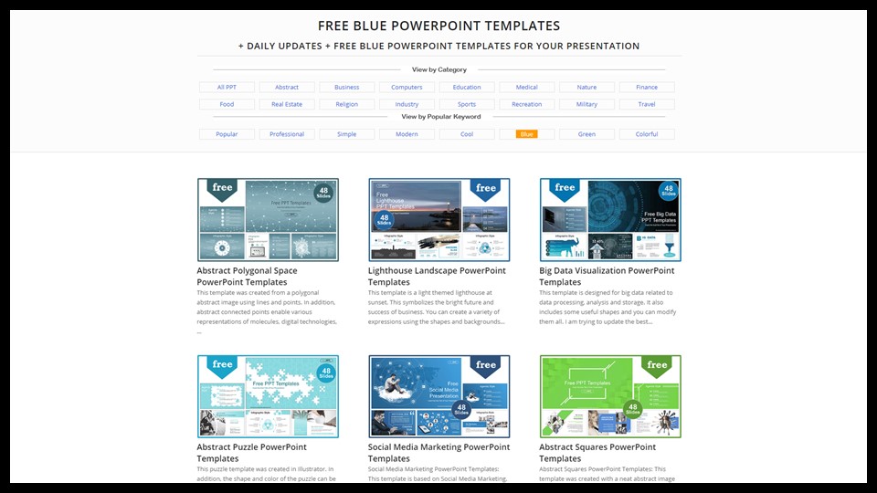 타이틀 바로 아래에 있는 카테고리를 선택하면 각 주제에 맞는 ppt 템플릿을 받을 수 있습니다. 비즈니스 카테고리로 들어가서 블루 키워드를 선택해 봤습니다. 역시 ppt에선 비즈니스하면 블루죠!!