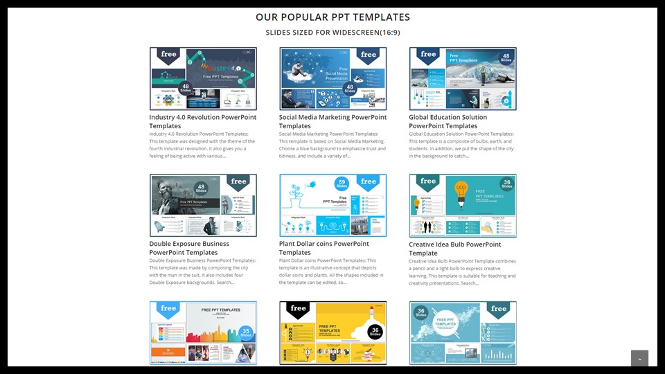메인 페이지로 돌아가서 조금 더 내려가면 인기 있는 ppt 템플릿 중 최근에 많이 사용되는 와이드 스크린용 슬라이드 크기(16:9)의 템플릿을 볼 수 있습니다.