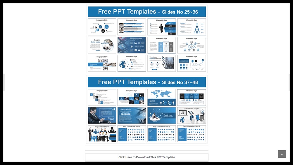 그리고 템플릿 마지막에는 이미지, 아이콘 등을 모아져 있어서 원하는 슬라이드를 만들 때 더욱 도움이 될 수 있게 되어있습니다. 마지막 하단에 보시면 다운로드할 수 있는 버튼이 있습니다. 이 다운로드 버튼도 본문 사이즈와 너비가 같은 크기로 되어 있습니다. 존경스럽습니다.^^